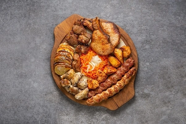Шейка, чалагач, куриное филе, люля-кебаб говядина, люля-кебаб курица, грибочки, картофель на углях
