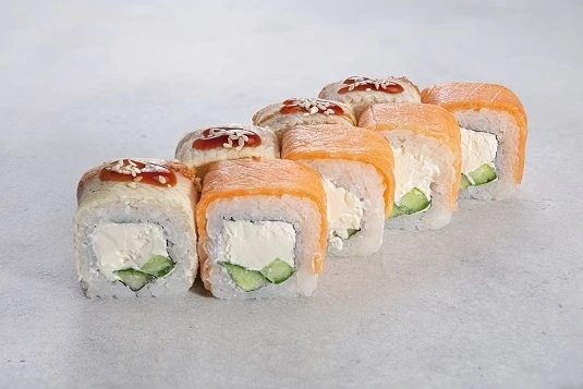 Лосось, сыр сливочный, угорь, огурец,соус унаги